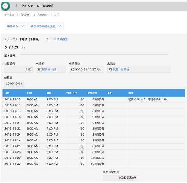 勤怠管理は、専用の用紙に各自が手書きで記入した勤怠情報を、総務の担当者が基幹システムに手入力をしていたようです。