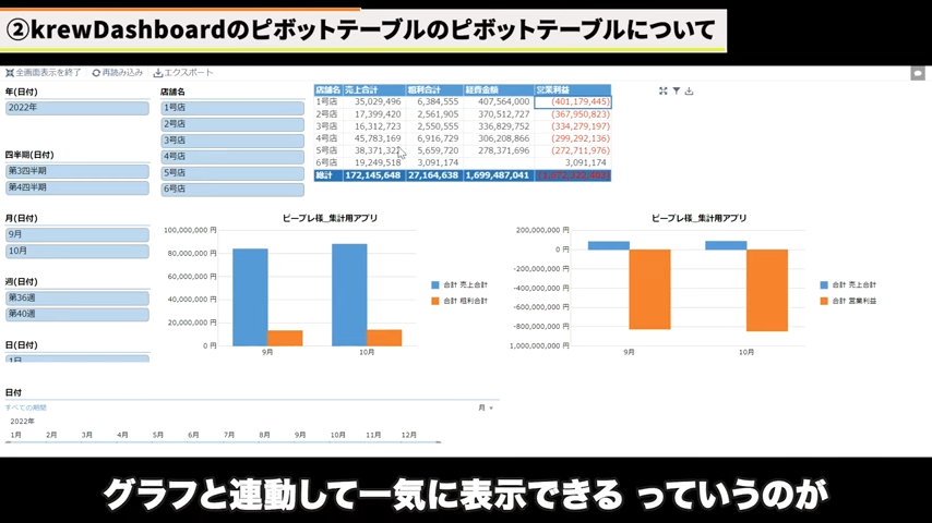 いろいろな縦棒ですとか、グラフと連動して一気に表示できるっていうのが一つ大きな特徴だと思いますが、違いについてっていうのは最後にご説明しますので、一旦krewDashboardのピボットテーブルっていうのはこんな感じです。