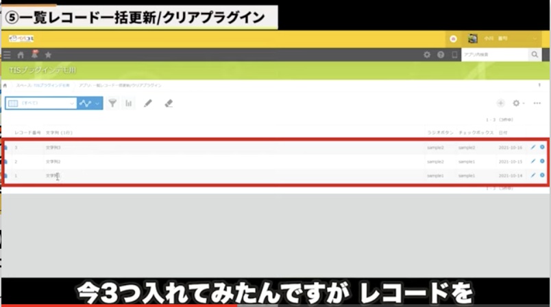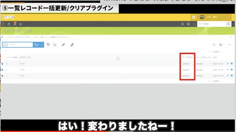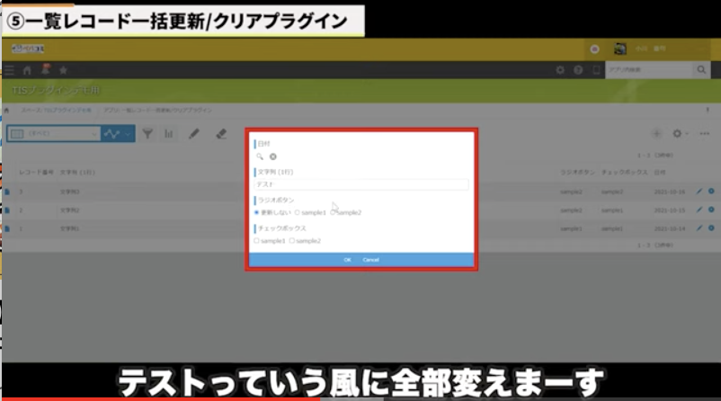 この一覧画面でフィールドの一括更新っていうボタンとフィールドの一括クリアっていうのがあります これを更新をして文字列(1行)とラジオボタンチェックボックスを作ったんですが文字列フィールドをテストっていう風に全部変えます
