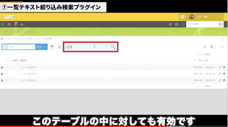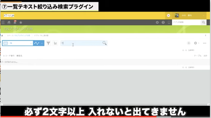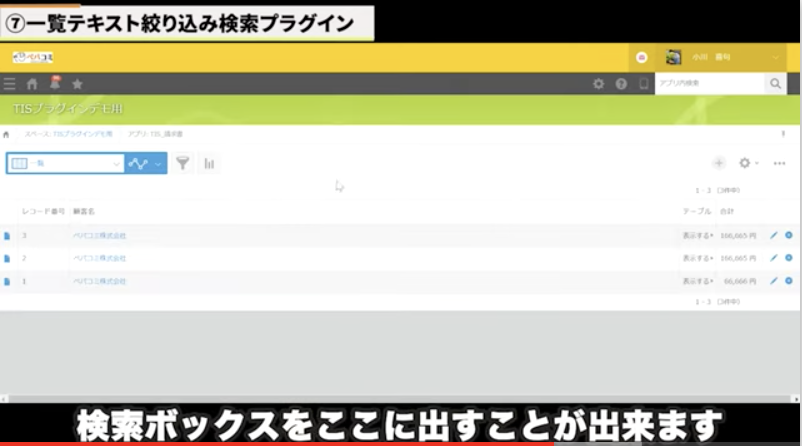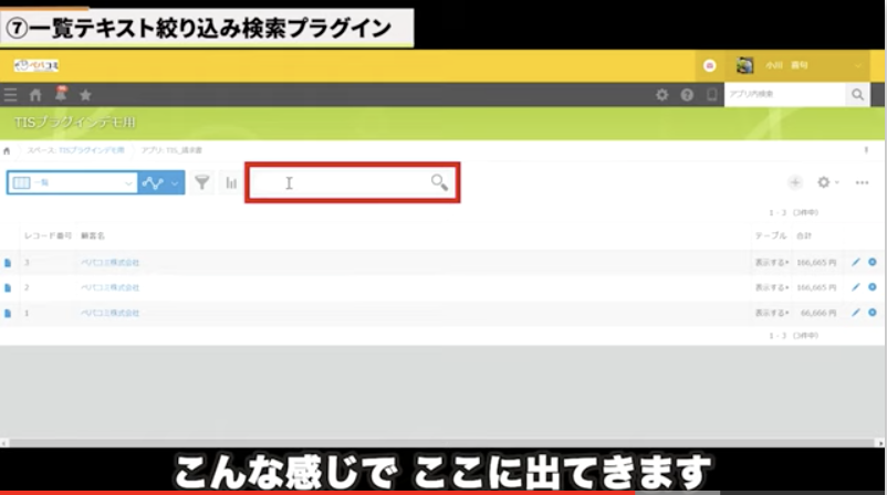 プラグインを入れると検索ボックスをここに出すことができます kintoneの標準機能だと検索が控えめに言ってクソなんですよ!絞り込みを押して顧客名選んでなんか含む〜・・・ってやらないと出てこないんですよ