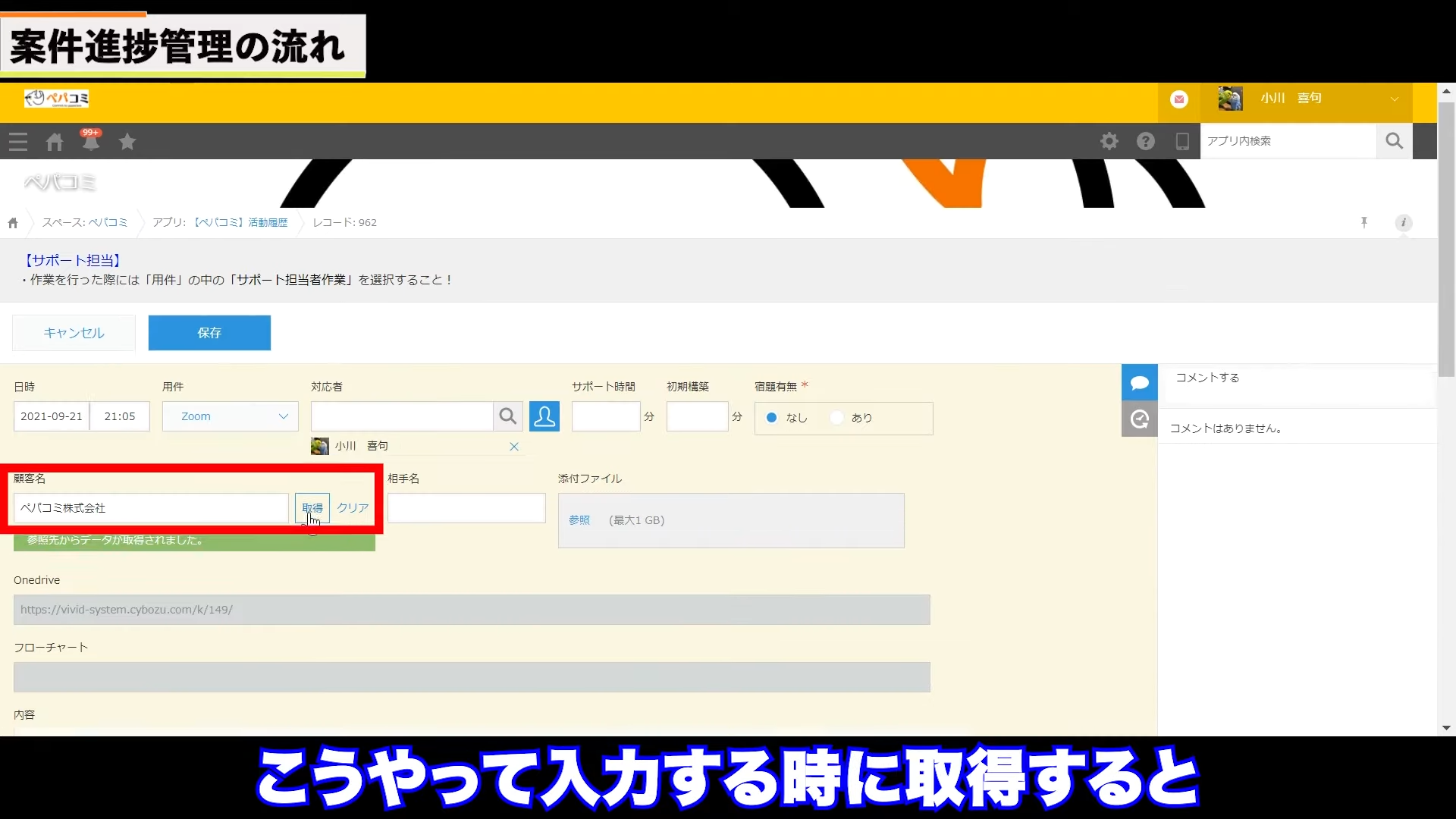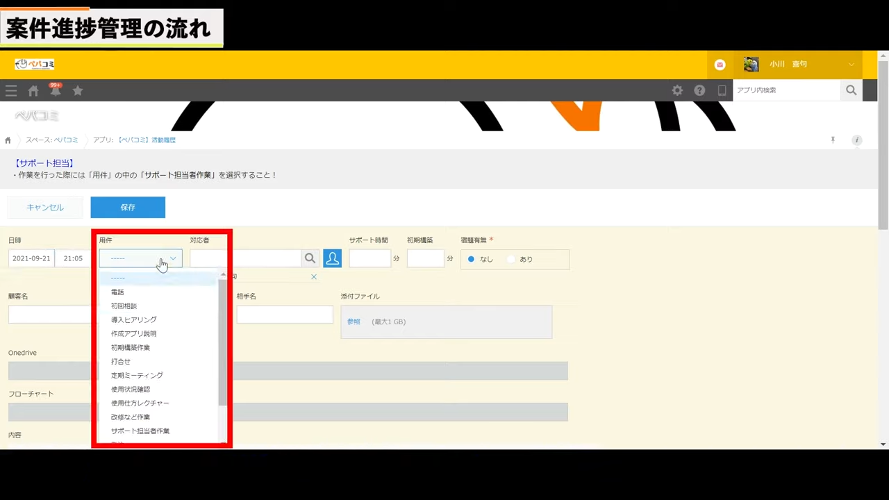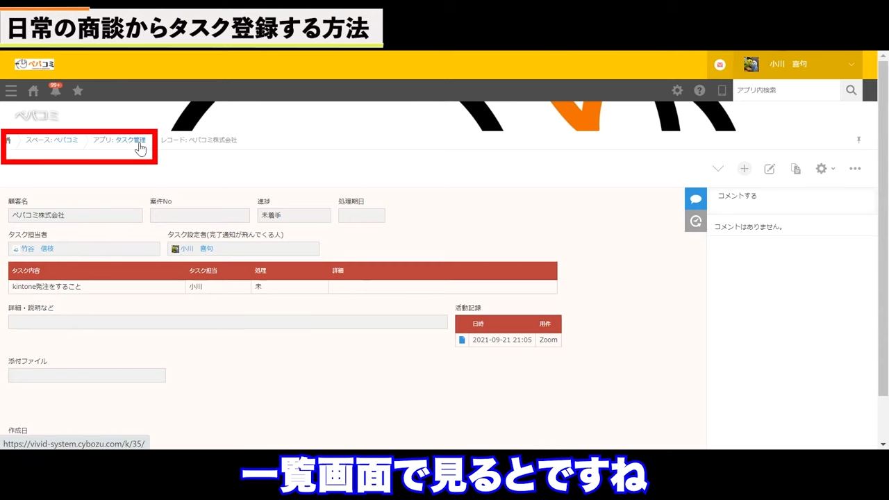 営業の商談をするたびに、活動履歴メモを入力していきます。例えば、顧客管理アプリでペパコミ株式会社という顧客のすべての履歴を見れるようにしたい場合、活動履歴アプリに活動内容を記録していきます。
