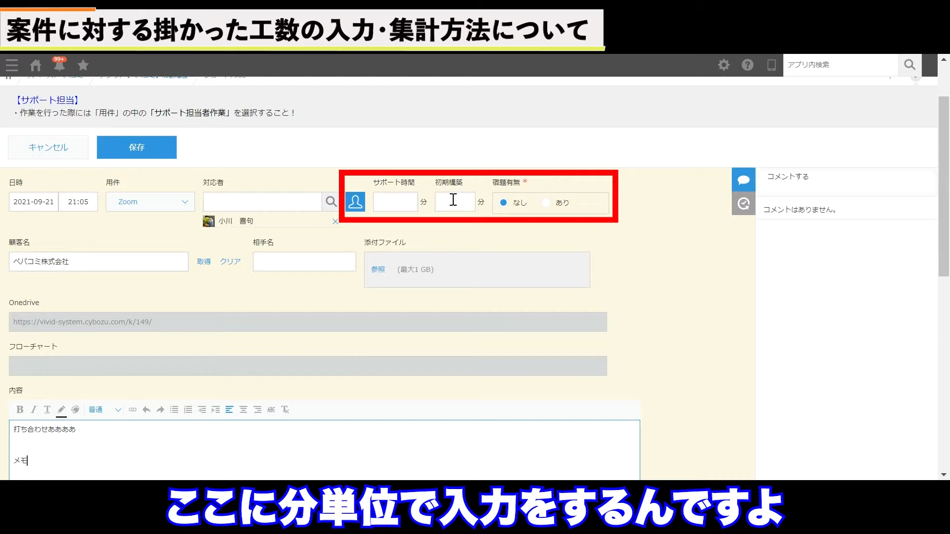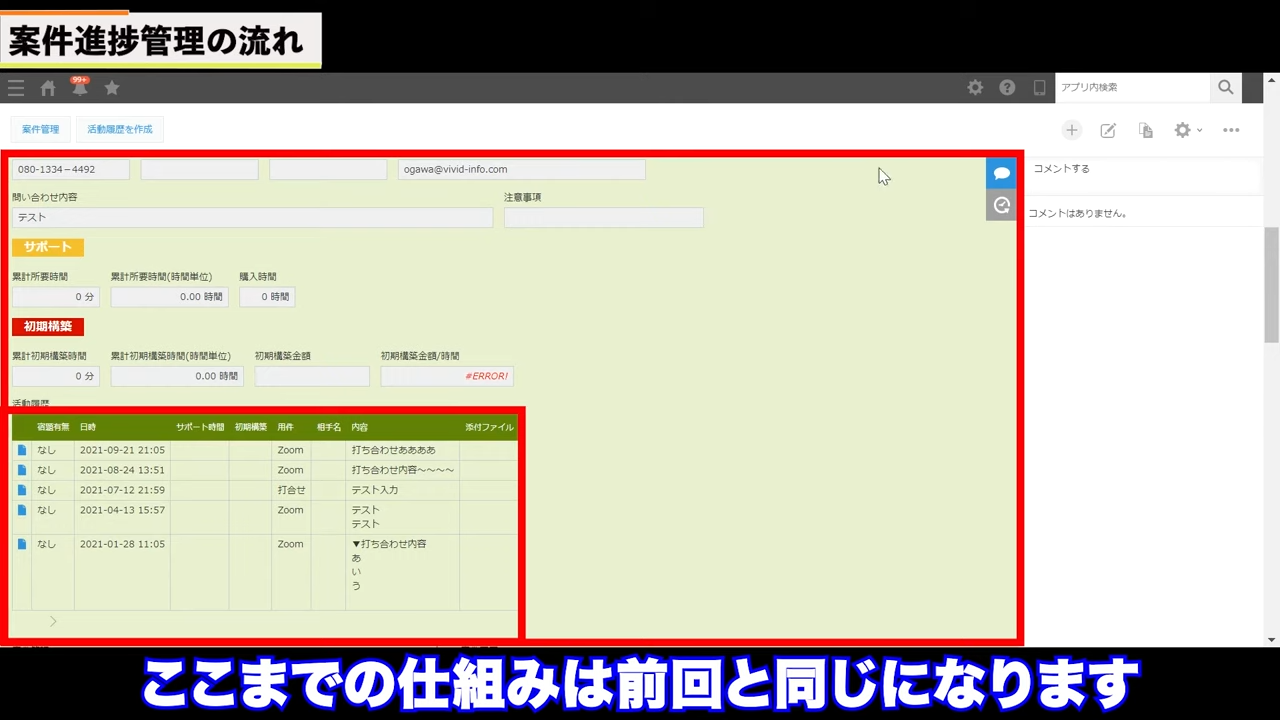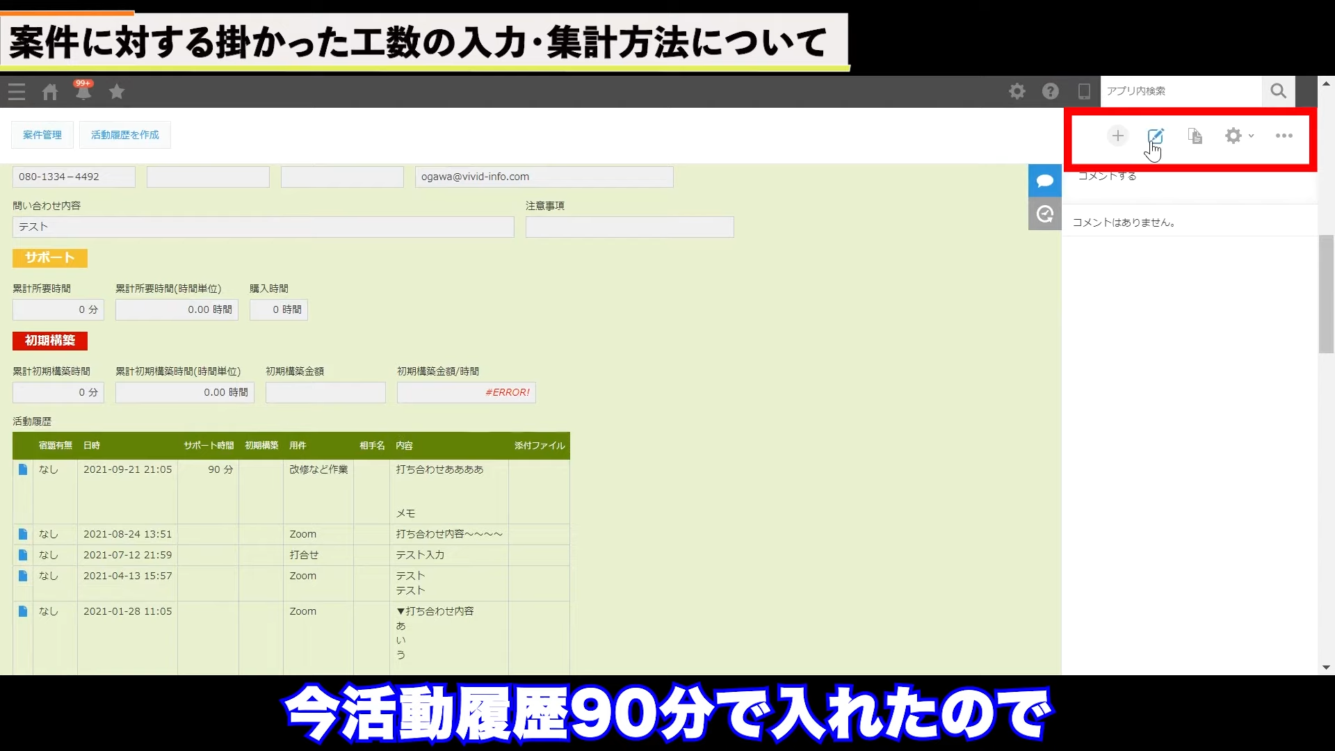 時間の集計は、活動履歴アプリで実現できます。商談内容をメモし、下の画面の赤枠内に、かかった時間を記録します。