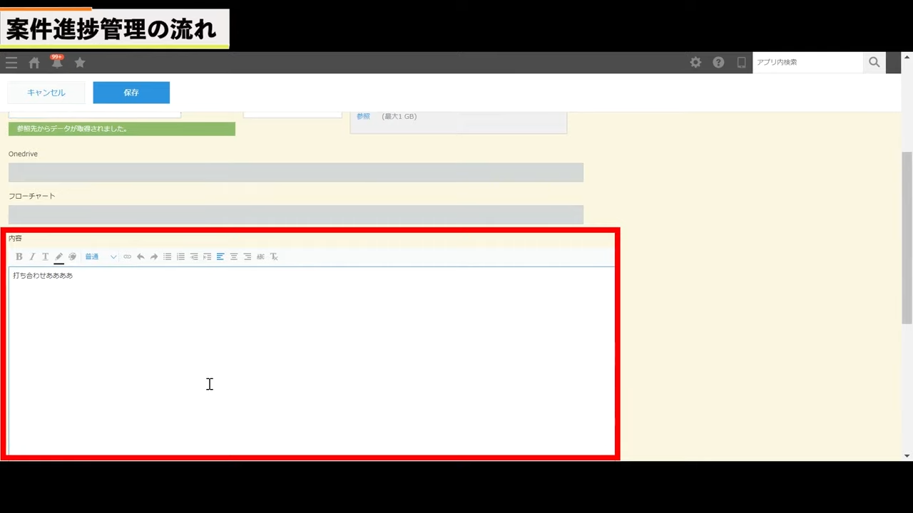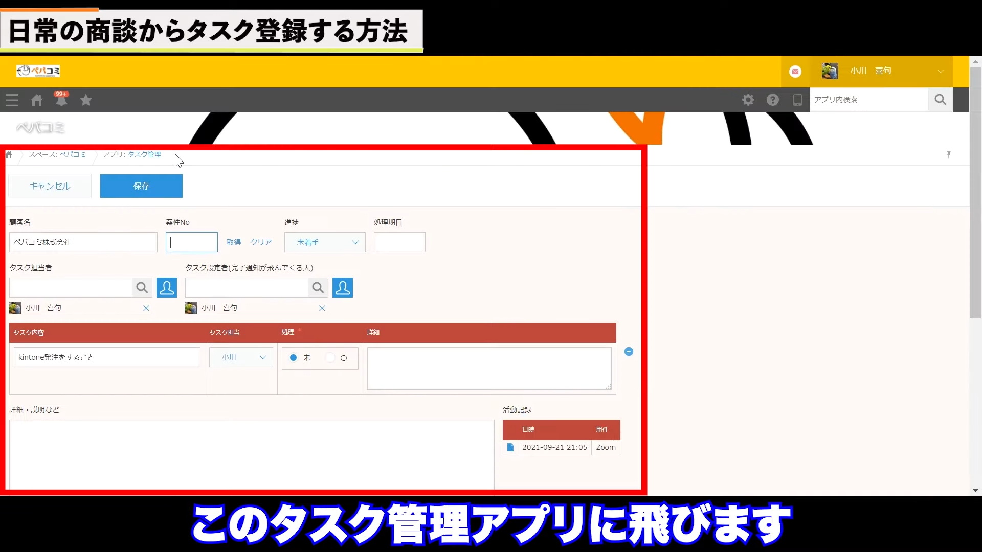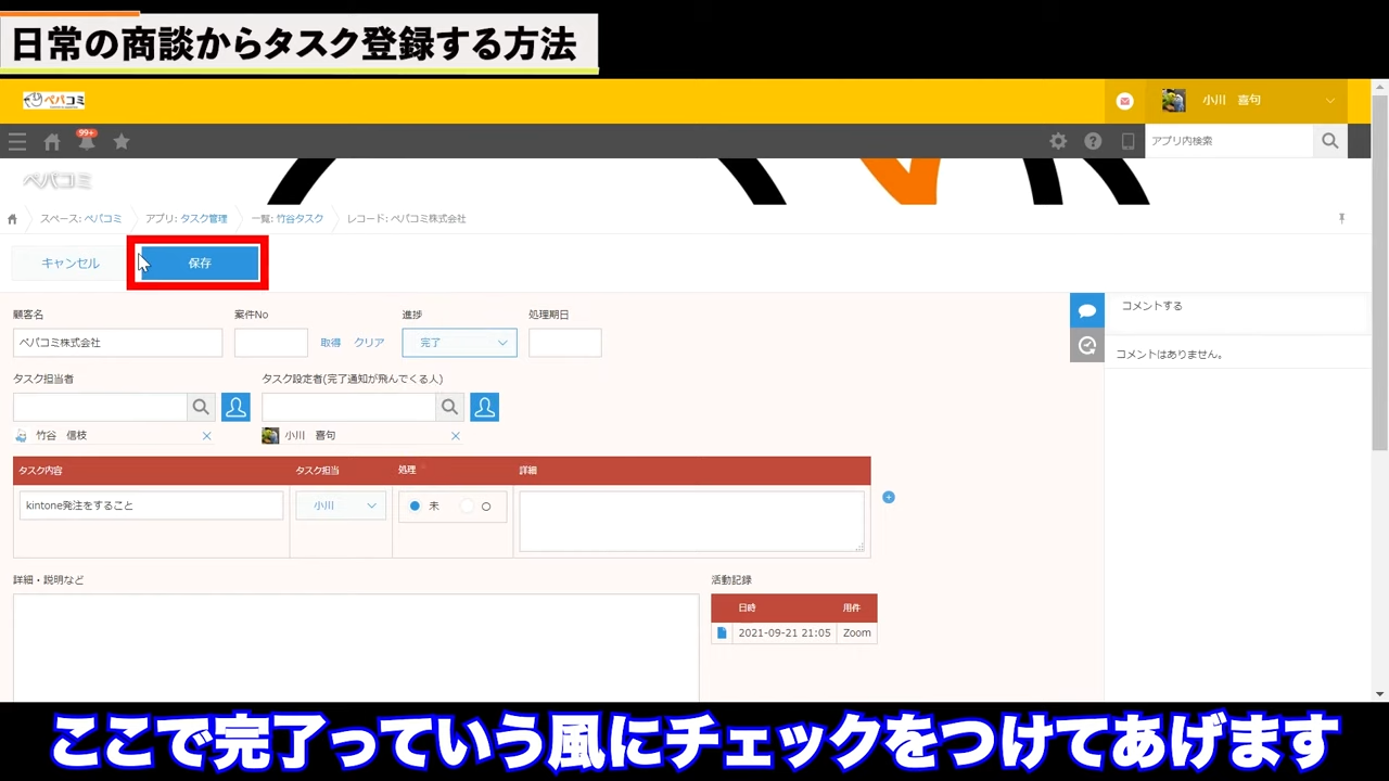 すると、タスク管理アプリに飛びます。先ほど活動履歴アプリ内で入力したタスク内容がそのまま表示されます。特に追加する内容がなければ、保存をクリックします。