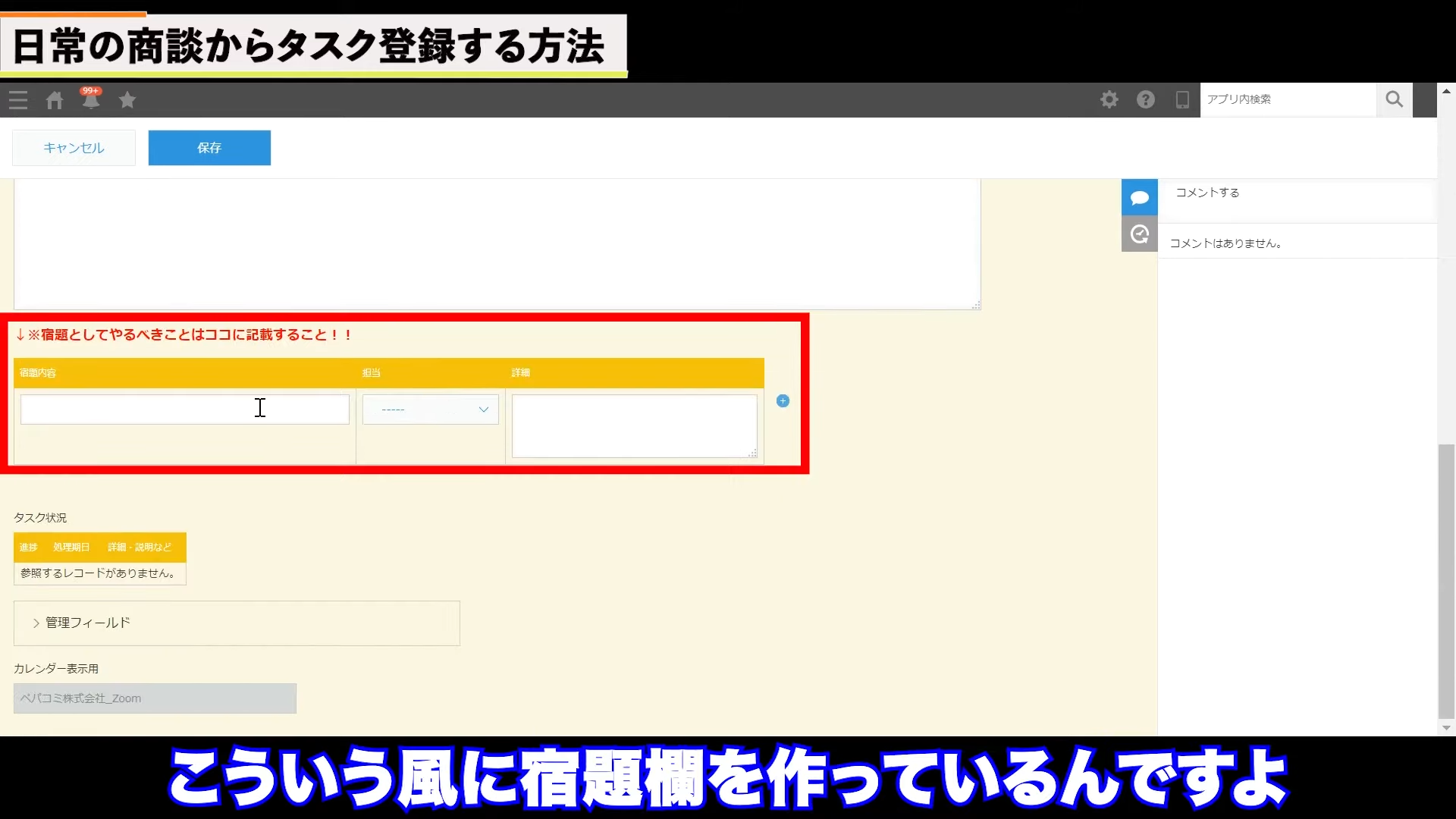 活動履歴アプリの下段に宿題欄があります。ここに、タスク内容と担当者を入力します。項目は自由に設定できます。入力が完了したら、保存をクリックします。