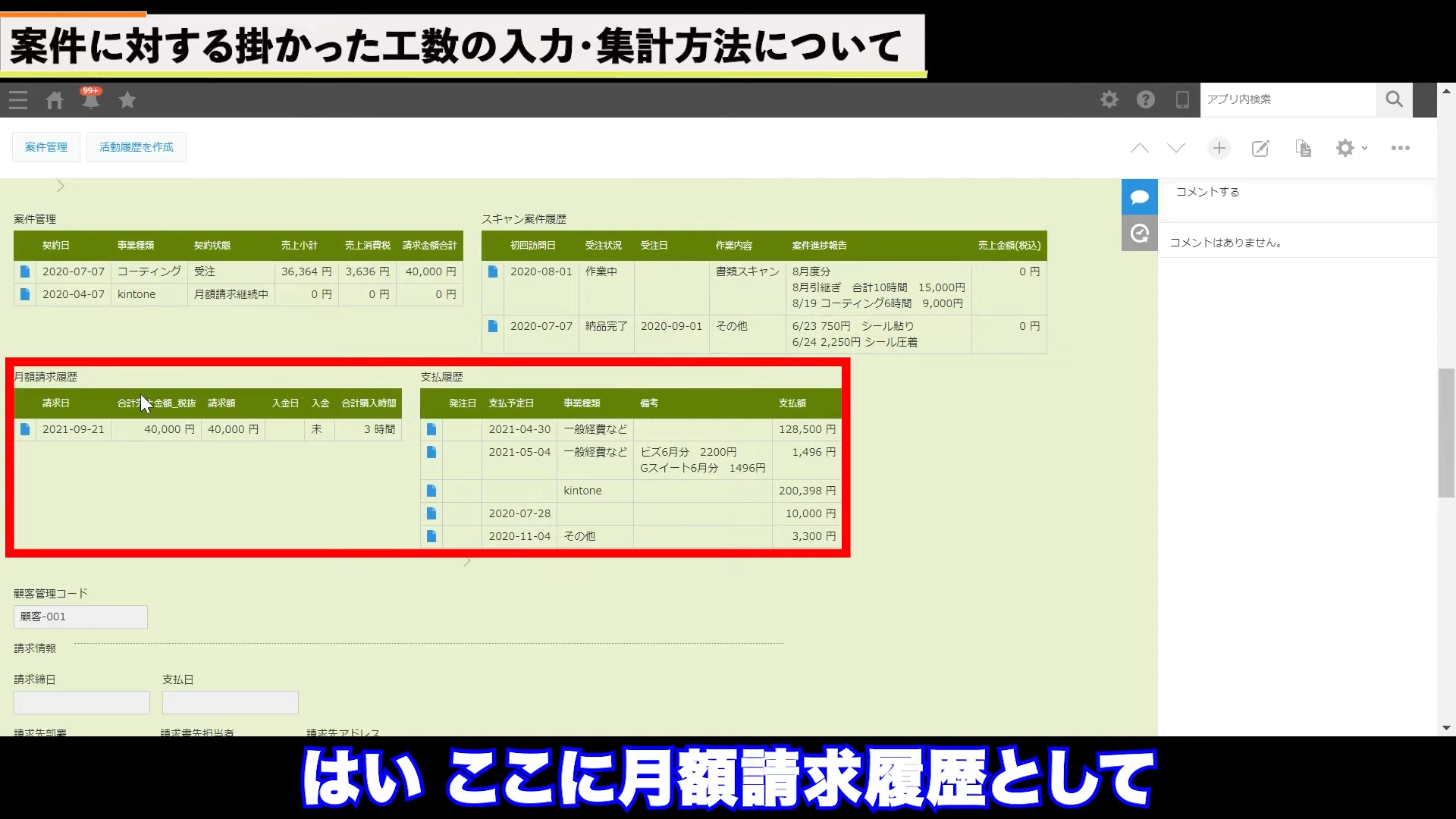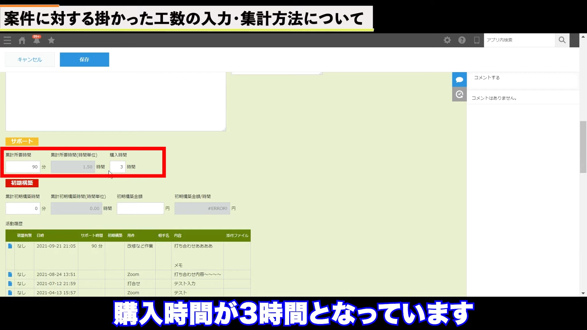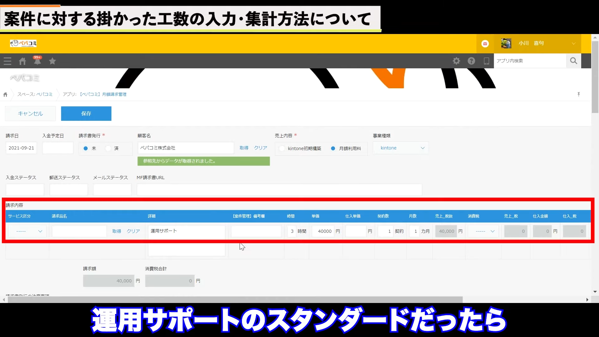 続いては、顧客が買ってくれた時間の集計です。これは、請求アプリで管理します。請求管理アプリを開き、下の画面の赤枠内に時間を入力し、保存をクリックします。