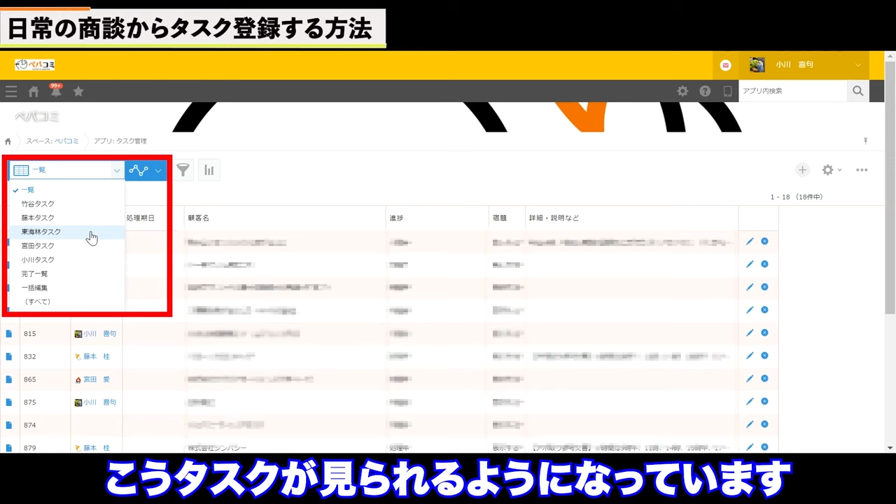 タスクを、一覧画面で見ることも可能です。下の画面の赤枠内をクリックします。