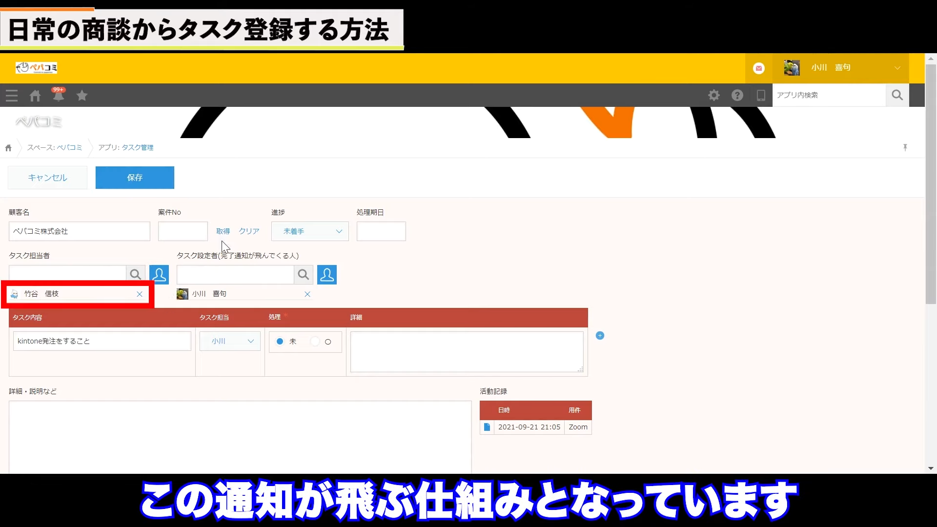 タスク担当者を竹谷に設定し、保存をクリックしました。すると、竹谷に通知が飛びます。