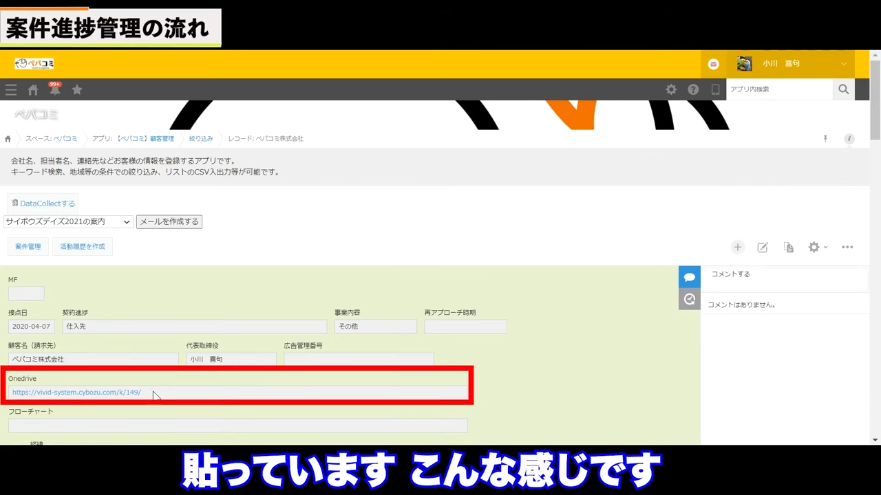 クラウドストレージのOnedriveに保存したフォルダを、フォルダ単位でリンクし、顧客管理アプリで確認することができます。