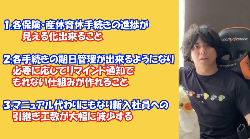 黒:せやろ?更に育休中の手続きみたいに数カ月単位で定期的に手続きすることもあるから それの期日管理とかもせなあかんのに各担当者の判断に任せているからどこかでもれそうで怖いねん