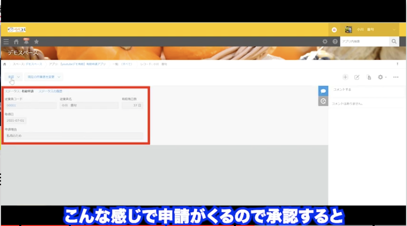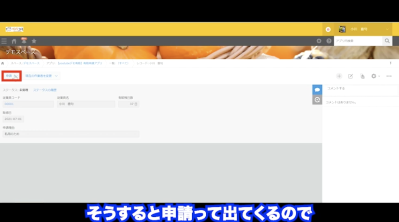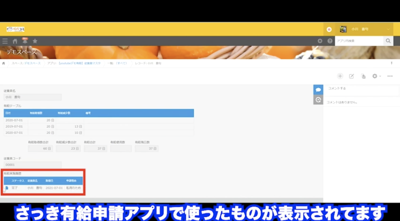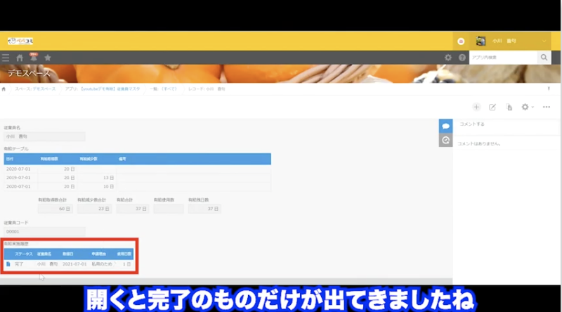 小川を見るとさっき有給申請アプリで作ったものが表示されています 完了となっています