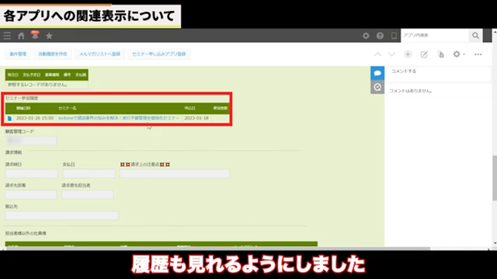 kintoneセミナー管理システムは、各アプリ間の連携を通じて、関連情報を効率的に表示します。
