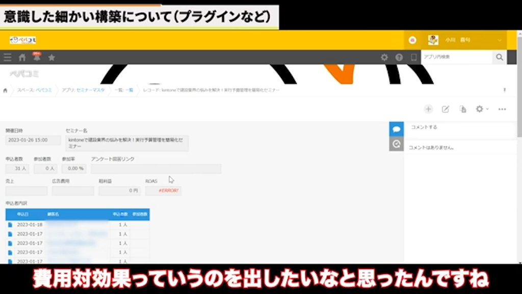 kintoneは、セミナーの実施効果を多角的に把握するための管理システム構築に活用できます。このシステムは、セミナー開催の履歴を管理し、広告費用の費用対効果を定量的に把握する目的で利用されます。