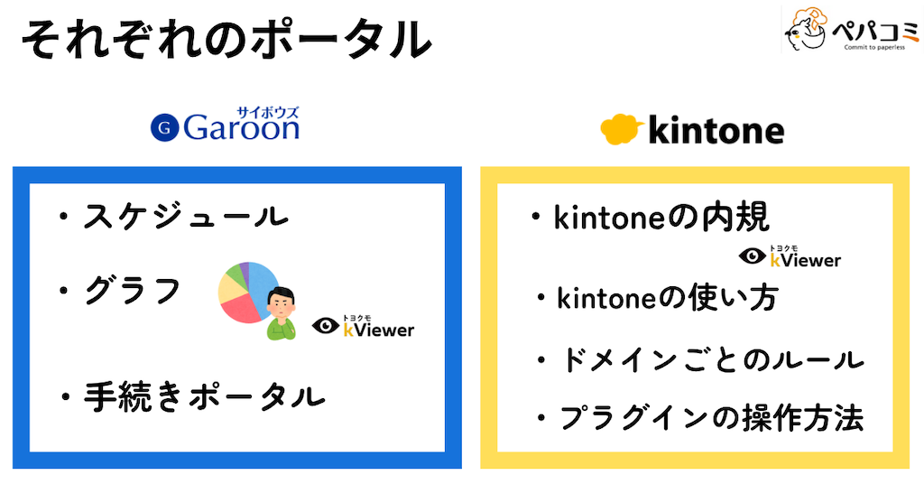 kintoneは「業務システムを自由に作れるクラウドプラットフォーム」であり、Garoonは「全社の情報共有に必要な機能が使えるグループウェア」です。