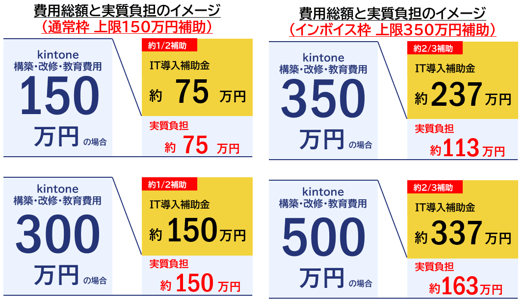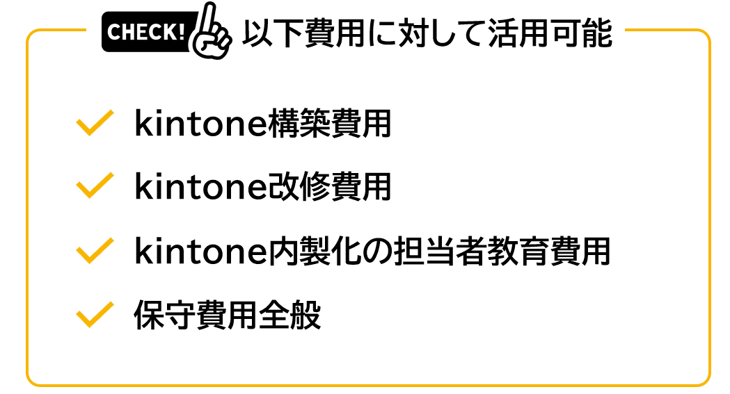 kintone導入に掛かる構築・内製化・改修費用が補助対象となり(*)最大350万円まで交付されます。