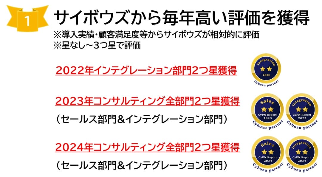 はい。サイボウズ認定のオフィシャルコンサルティングパートナーです。数々の賞を受賞しており、評価を頂いております。