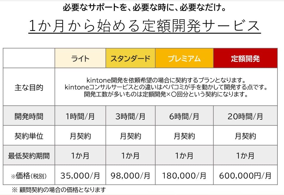 ぺパコミでは、kintone導入後のサポートを1か月単位で承っており、期間の縛りはありません。
