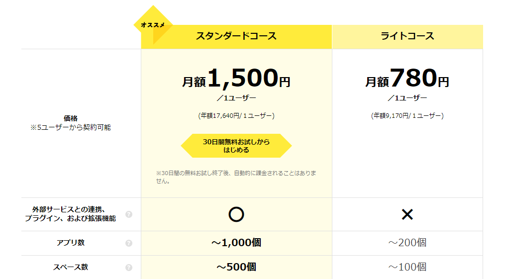 kintone(キントーン)は初期費用が無料でランニングコストを抑えられるのが特徴です。運用は2つのコースがあり「ライトコース」であれば1ユーザーあたり月額780円、一方で「スタンダードコース」であれば1ユーザーあたり月額1,500円で利用できます。
