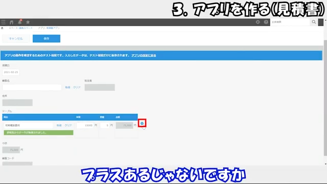 すると、見積書アプリで行を増やしたい欄の右側に+が表示されるので、ここをクリックすると行を増やせるようになります。