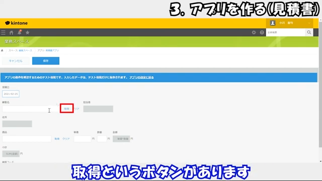 ルックアップフィールドでは、取得を選択すると、紐づけてあるマスタが表示されます。住所と担当者欄にも自動的に入力されます。
