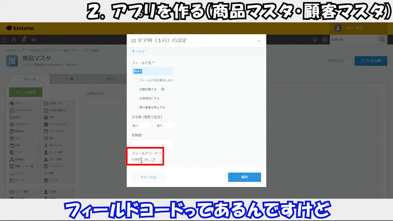 文字列(1行)フィールドのフィールド名に「商品名」と入力します。赤枠のフィールドコードは、はじめは適当な番号が振られているのですが、「商品名」とフィールド名と同じ内容を入力しておきましょう。