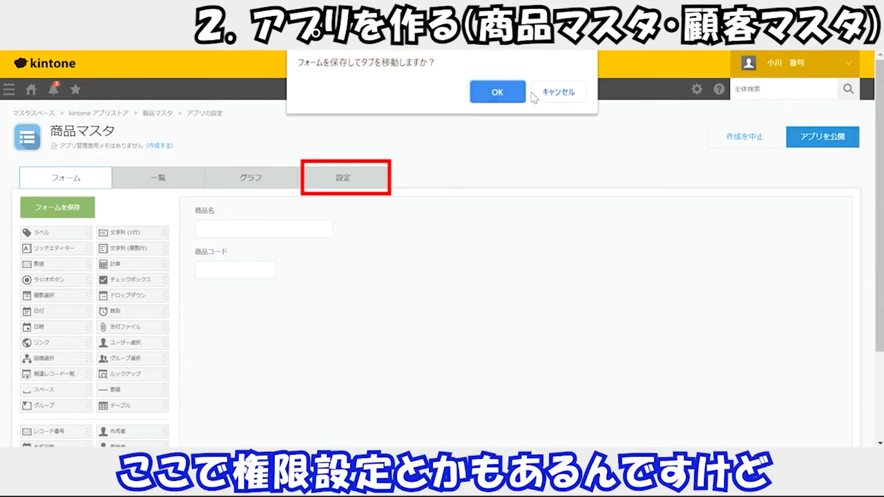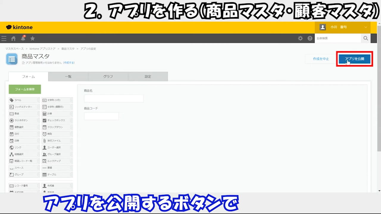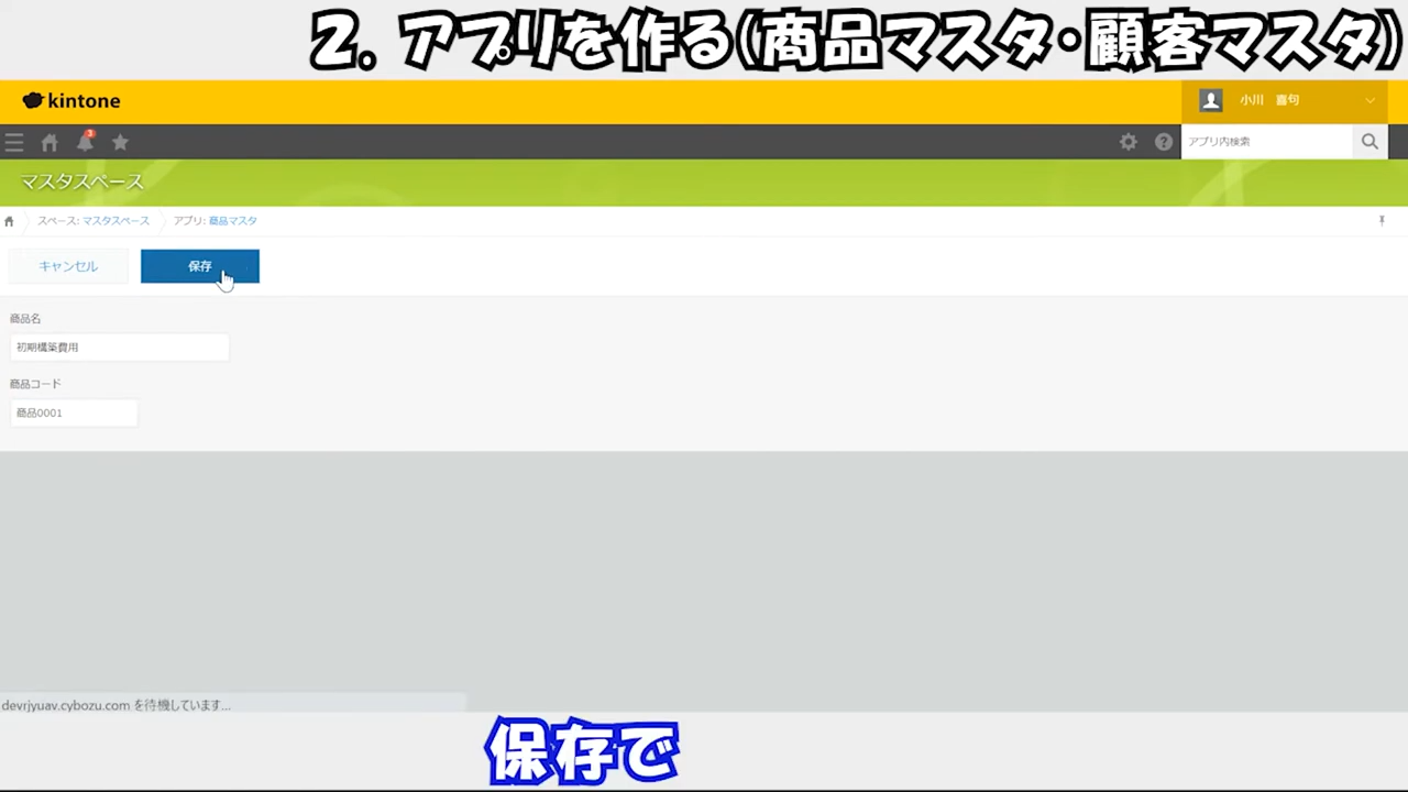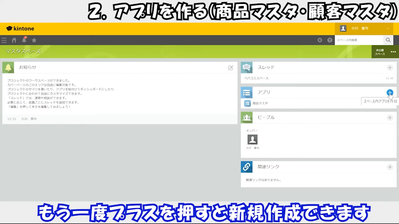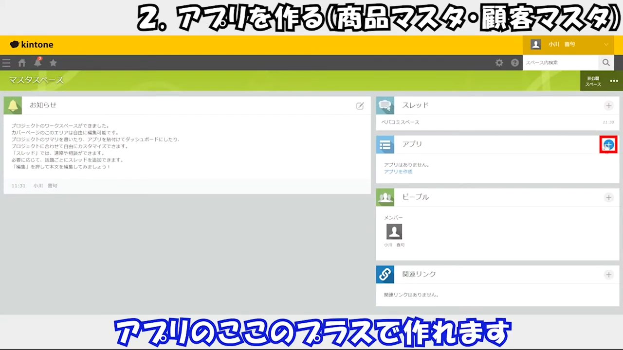 まずは商品マスタです。マスタスペースに入って、アプリの+をクリックするとアプリの作成画面に移ります。