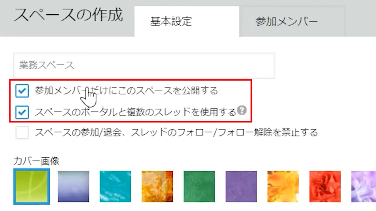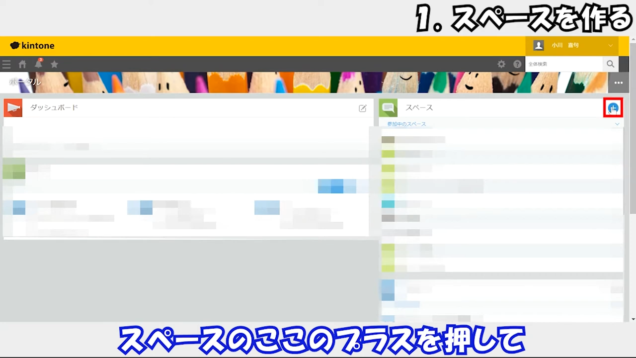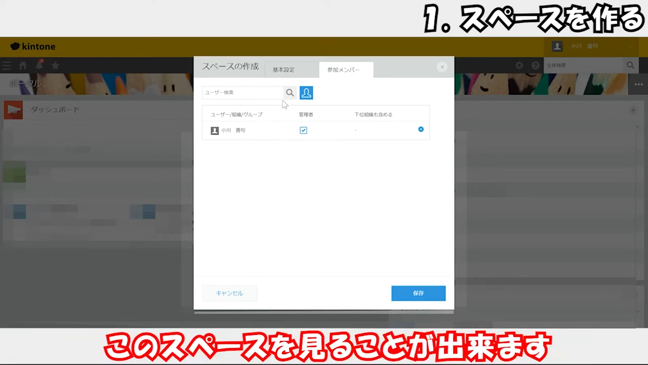 まずはスペースを作成します。kintone(キントーン)のスペースとは、kintone(キントーン)上で特定のメンバーがアクセスでき、コミュニケーションを取れる空間のこと。スペースとアプリを紐づけたり、ファイルを共有したりできます。