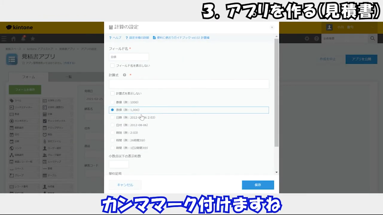 金額や小計は、単価×数量の計算をするので、計算フィールドを利用します。金額や単価、小計の場合は、カンママークをつける設定をします。