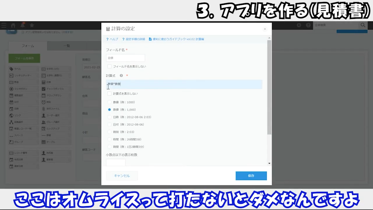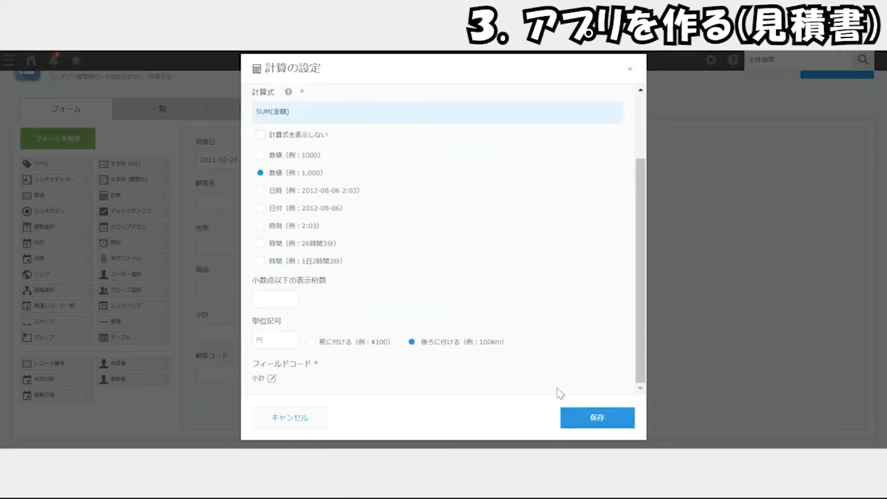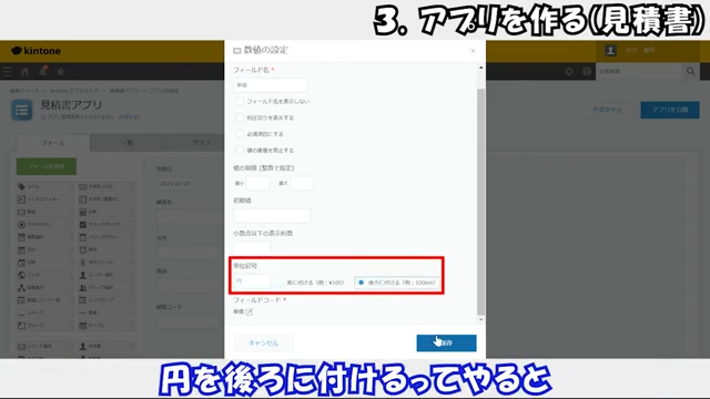 単価と数量は数値フィールドです。計算式を扱う際は数値フィールドを利用しましょう。円を後ろにつけるを選択すると、フィールドの右側に円と表記されます。