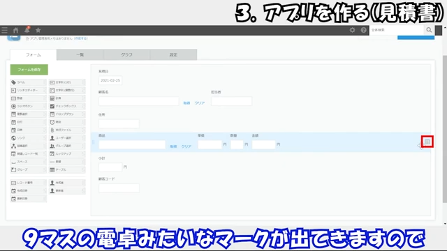 見積書を数行作成したいときは、テーブル機能を利用しましょう。設定に戻り、増やしたい行の右側に電卓のようなマークが表示されるので、ここで「テーブルにする」をクリックします。