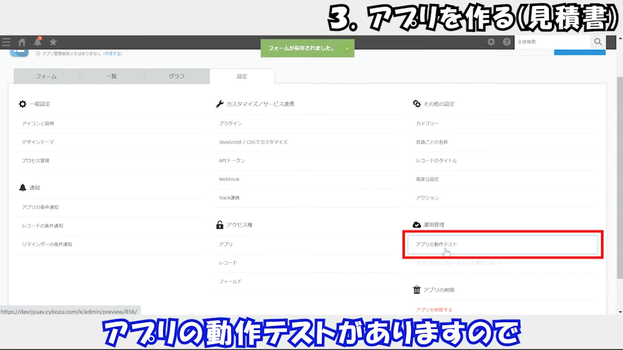設定が完了したら、下の画面赤枠内のアプリの動作テストをしてみましょう。