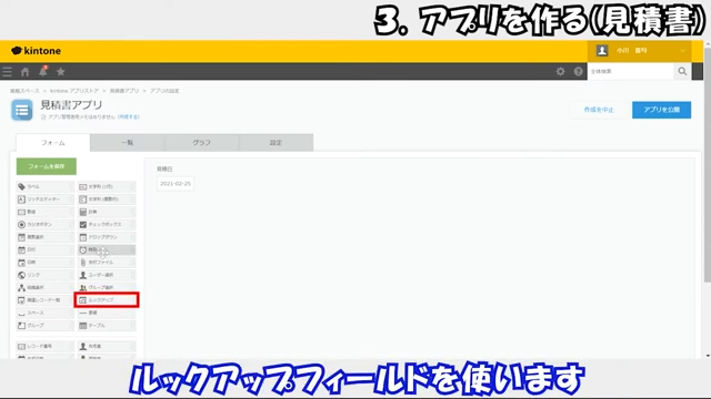 まずは顧客名です。ルックアップフィールドは、どのアプリから紐づけるかの設定が必要です。今回は顧客マスタから紐づけるので、顧客マスタを選択します。