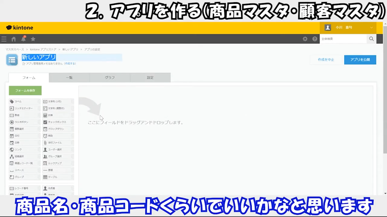 「はじめから作成」をクリックすると、初期画面に移ります。今回は商品マスタなので、作る項目は商品名と商品コードです。