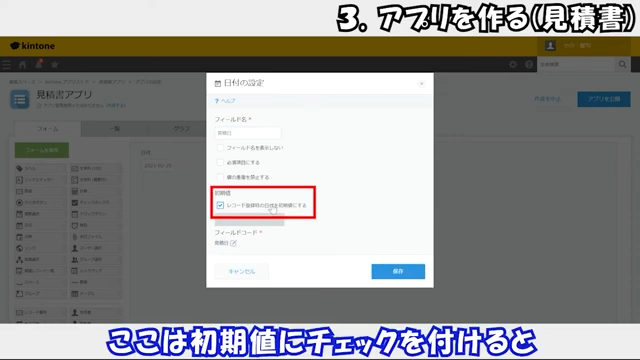 赤枠内は、初期値にチェックをつけると、作成した日付が自動的に入力されます。