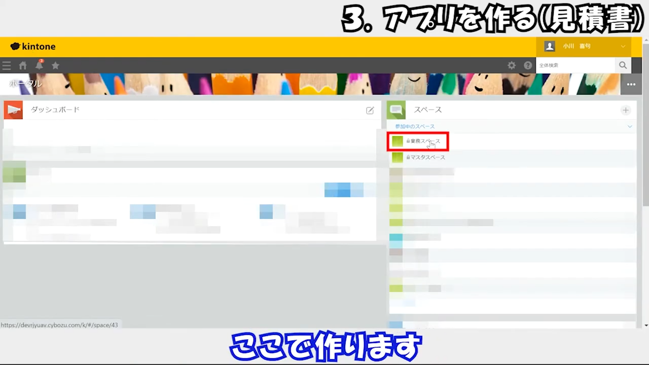 見積書アプリは業務スペースに作成するので、トップに戻り、下の画面の赤枠内をクリックし、作成します。