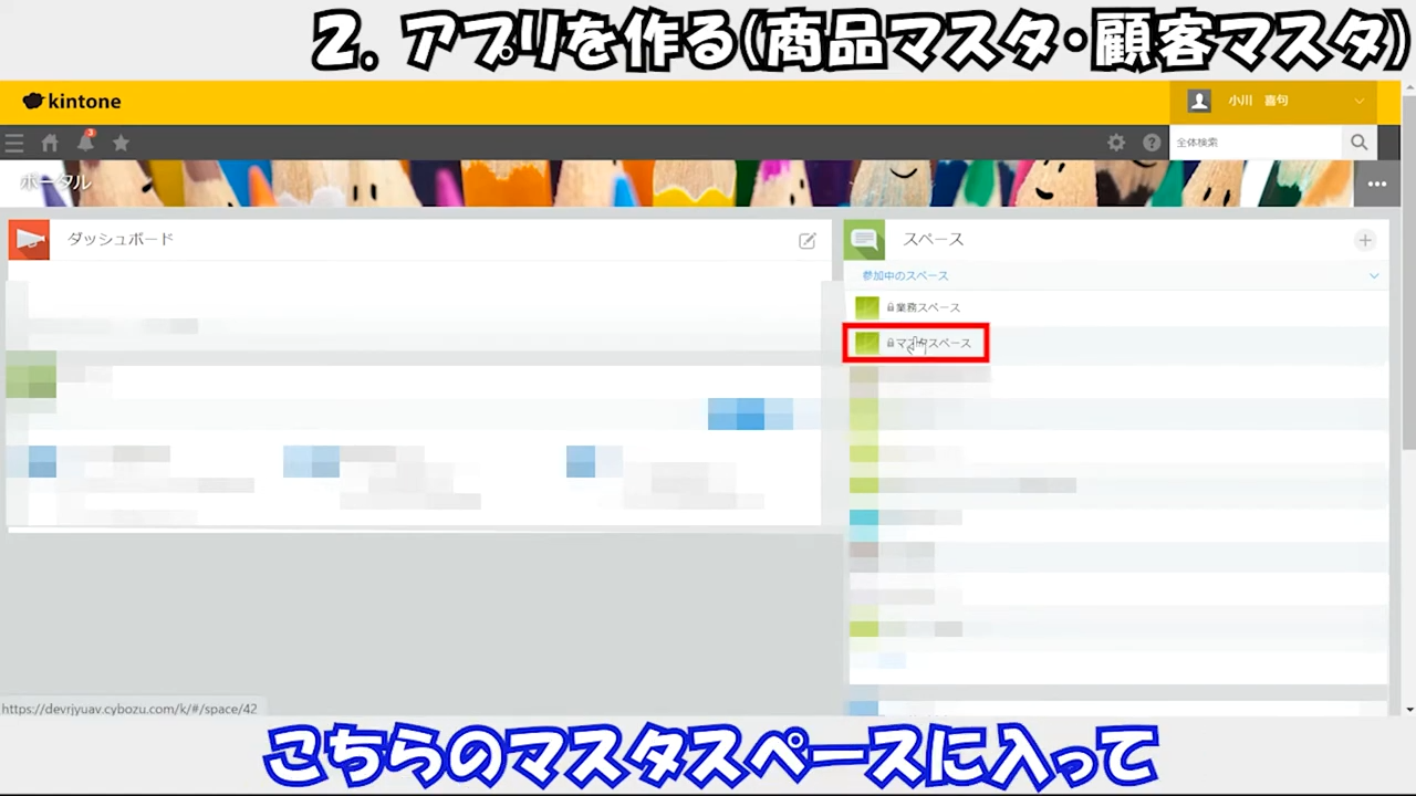 スペースは、下の画面赤枠の+をクリックします。スペース名を入力し、スペースを作成します。今回は、「マスタスペース」というスペースを作成しました。