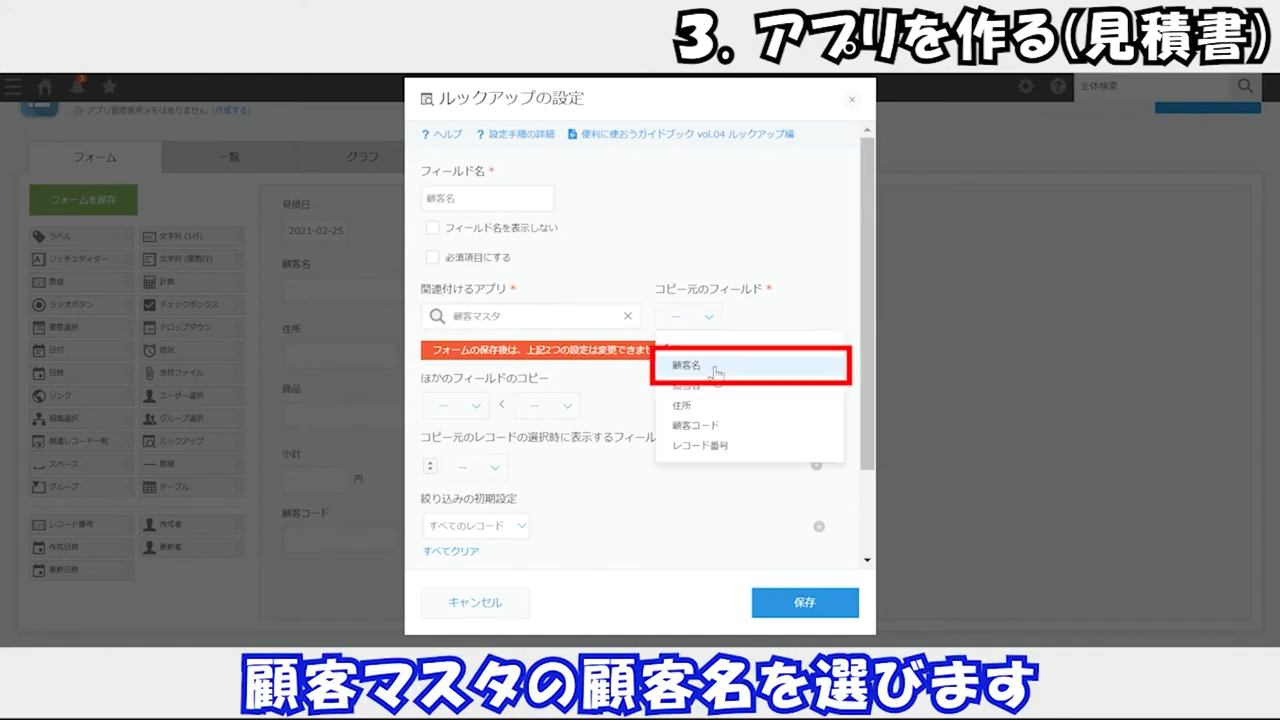 続いて顧客名は顧客マスタから紐づけるため、ルックアップフィールドを使います。