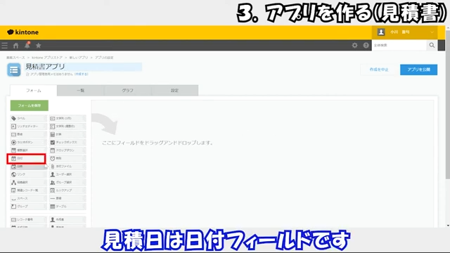 見積日は、日付フィールドです。ここからの作業では、忘れずにフィールドコードとフィールド名を同じにしてください。