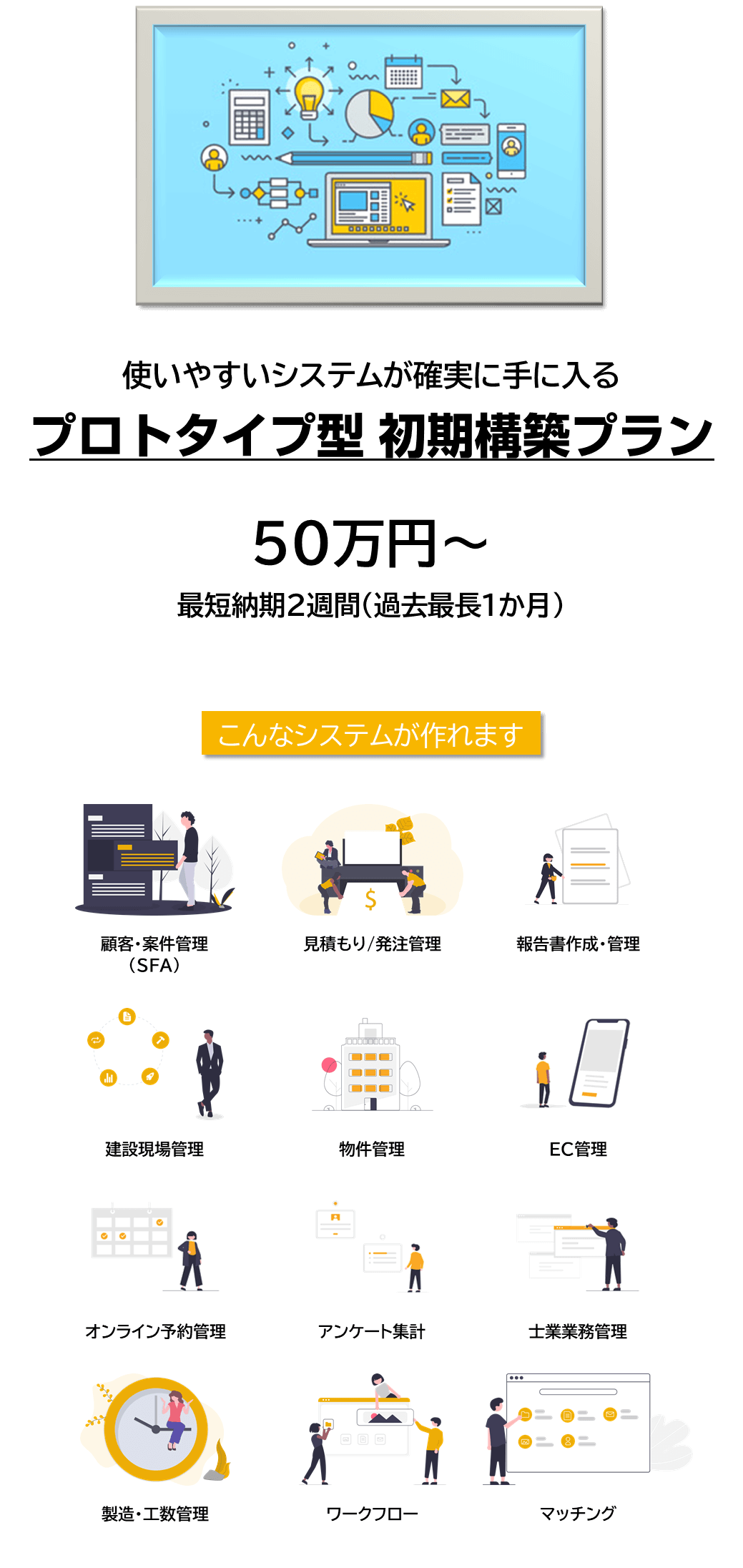 お客様が認識している課題だけでなく、潜在的な課題まで掘り起こした上で優先順位付けを行い、kintoneで具体的にどう解決していくかをご提案いたします。
