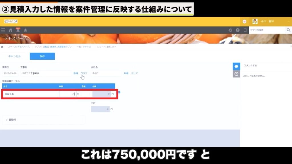 次に、協力会社さんがkintoneにログインし、「見積管理アプリ」を開きます。すると自社宛ての依頼だけが表示されているので、そこを開いて「75万円」「100万円」といった具合に、金額を入れて保存します。