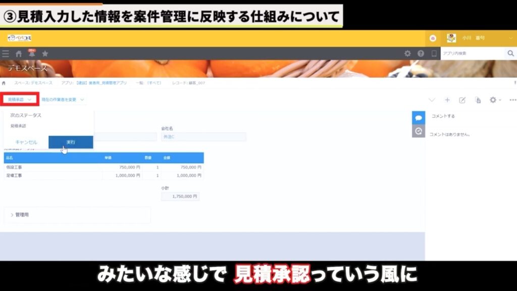 次に、kintone導入企業である元請け側に通知が来るので、内容を確認して問題がなければ「見積承認」します。