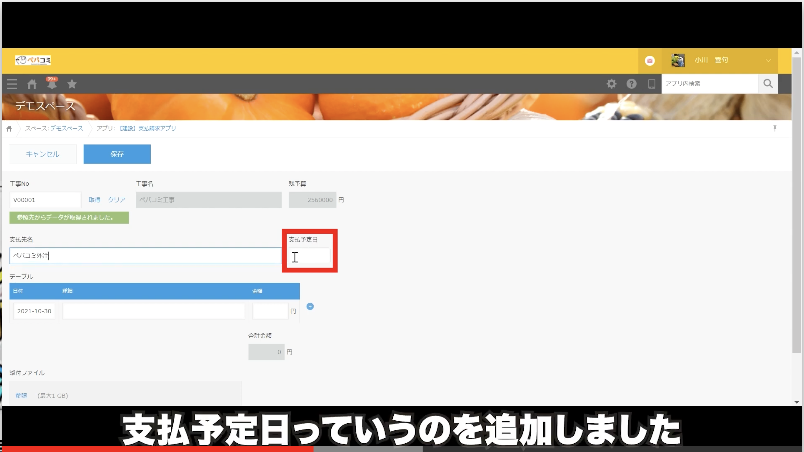 で、ここに前回にない項目支払予定日っていうのを追加しました。