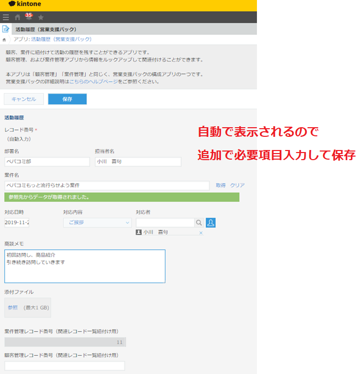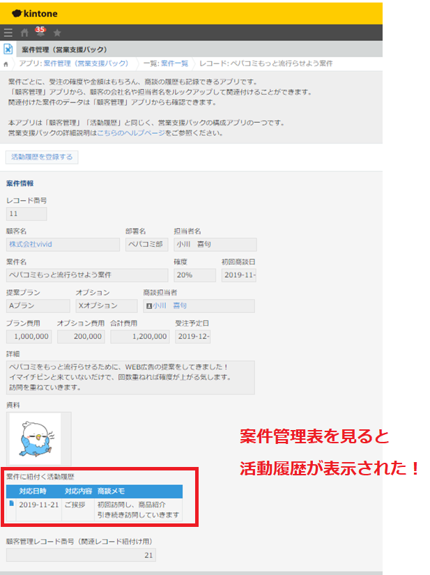 これだと案件管理が出来ただけなので、活動履歴も登録しておきましょう。