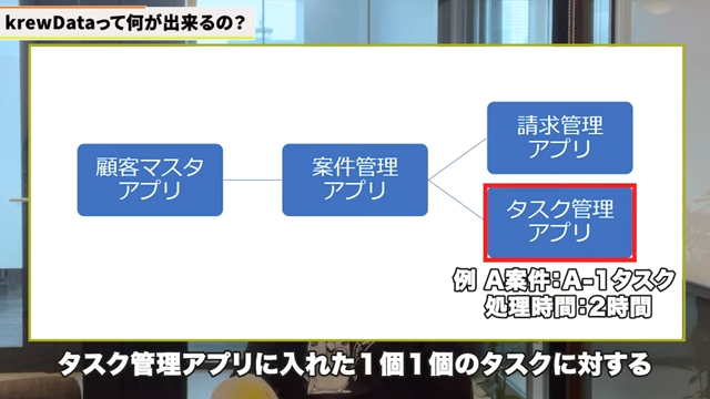 ただkrewdataはアプリを跨いだ集計ができるようになります。例えばタスク管理アプリにタスク処理時間を入れて、その時間を案件管理アプリに集計して案件処理に掛かった時間を算出するといったことが出来ます。