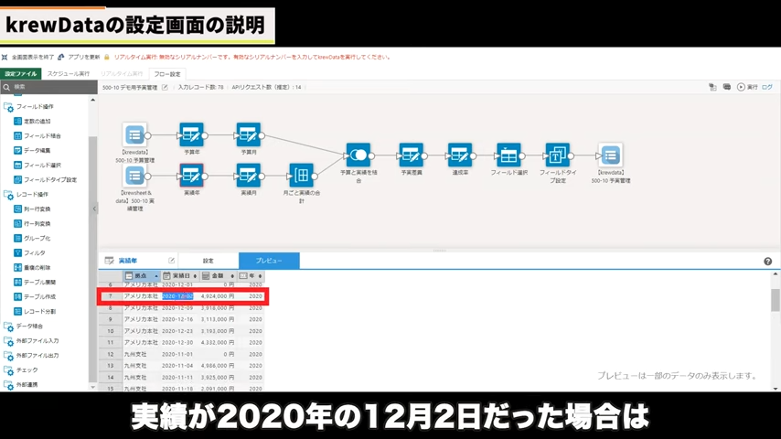 今回は予実のデータを年月別で合算していましたが、例えば実績データを押すとkrewDataの良いところは1個1個のコマンドに対してプレビュー機能ついています。