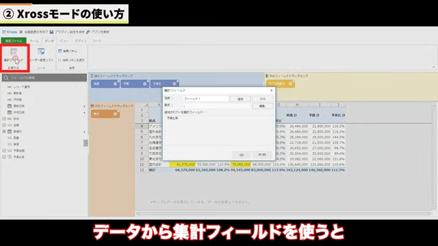 あとは集計フィールドといって例えば予実費を出したい場合、実績÷予算 予実データ持ってない場合も予実費っていうのを新たに作ることができます