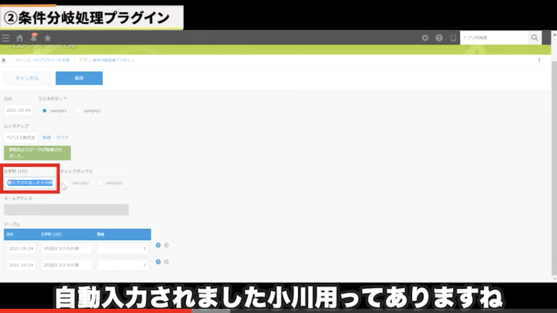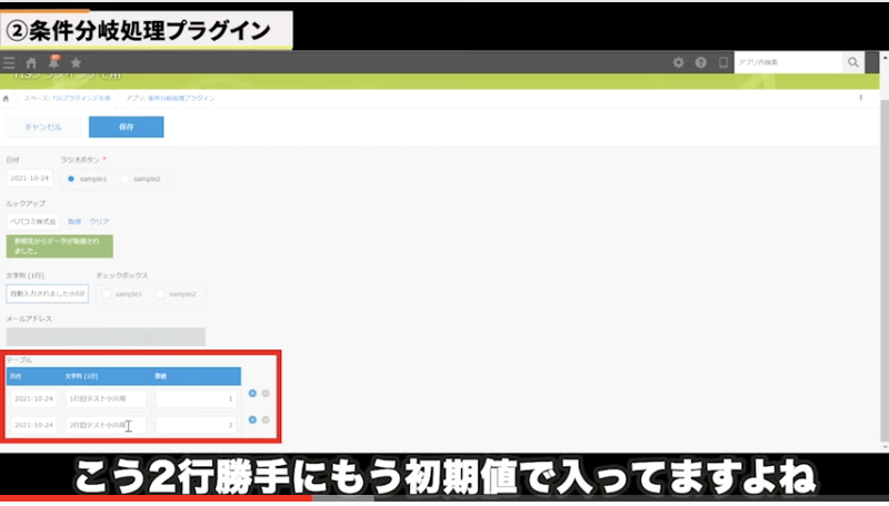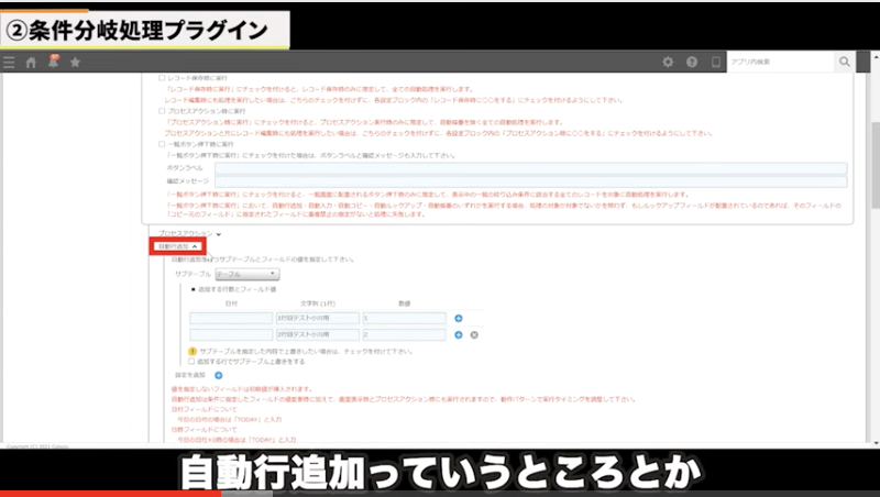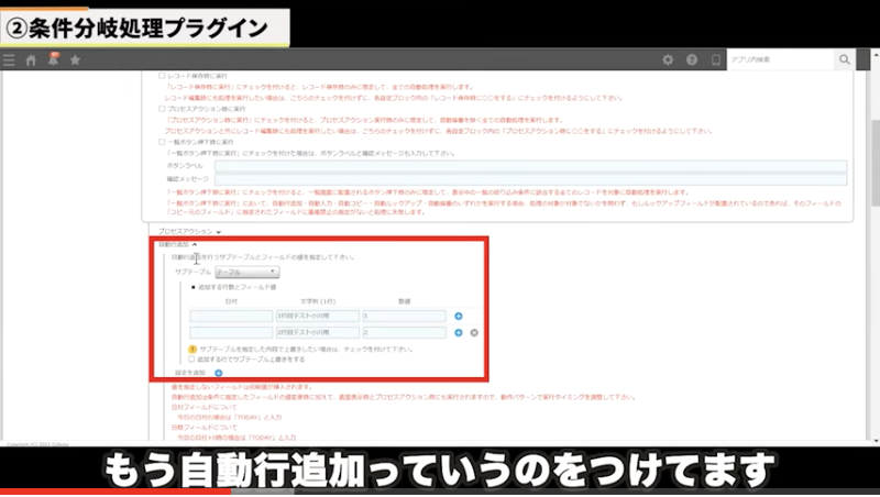 今回はもう自動追加っていうのをつけています サブテーブルで2行目まであらかじめ初期値として入れておいて、さらにテーブル内の文字列(1行)とか、数値も1、2って入るようにしています