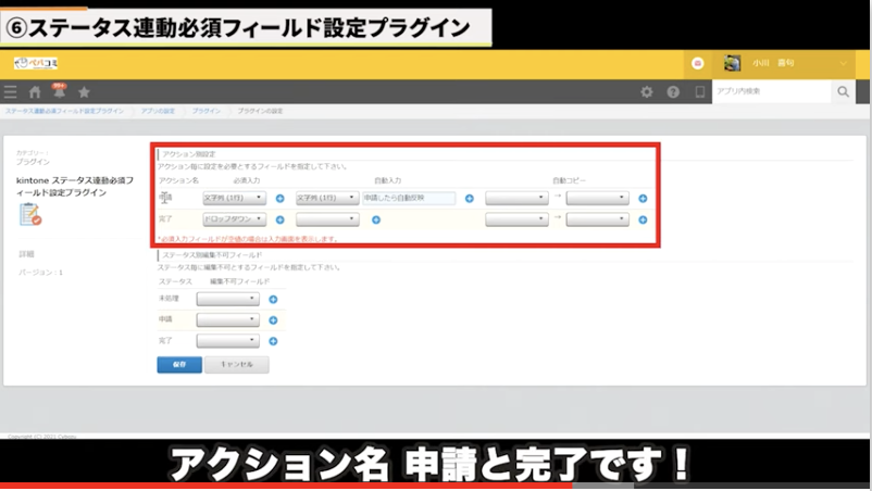 今回設定したのがこんな感じでアクション名、申請と完了です