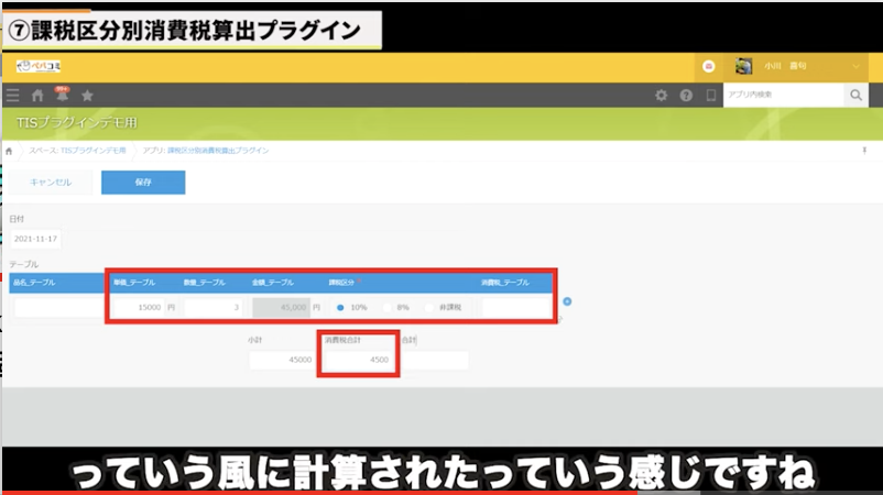 単価15,000円、数量3って入れると45,000円、10%なので消費税が4,500円っていう風に計算されたっていう感じですね