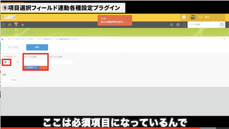 試しにラジオボタンでAとBって選択肢を設けたんですがAだった場合はAだったら必須っていう文字列フィールド